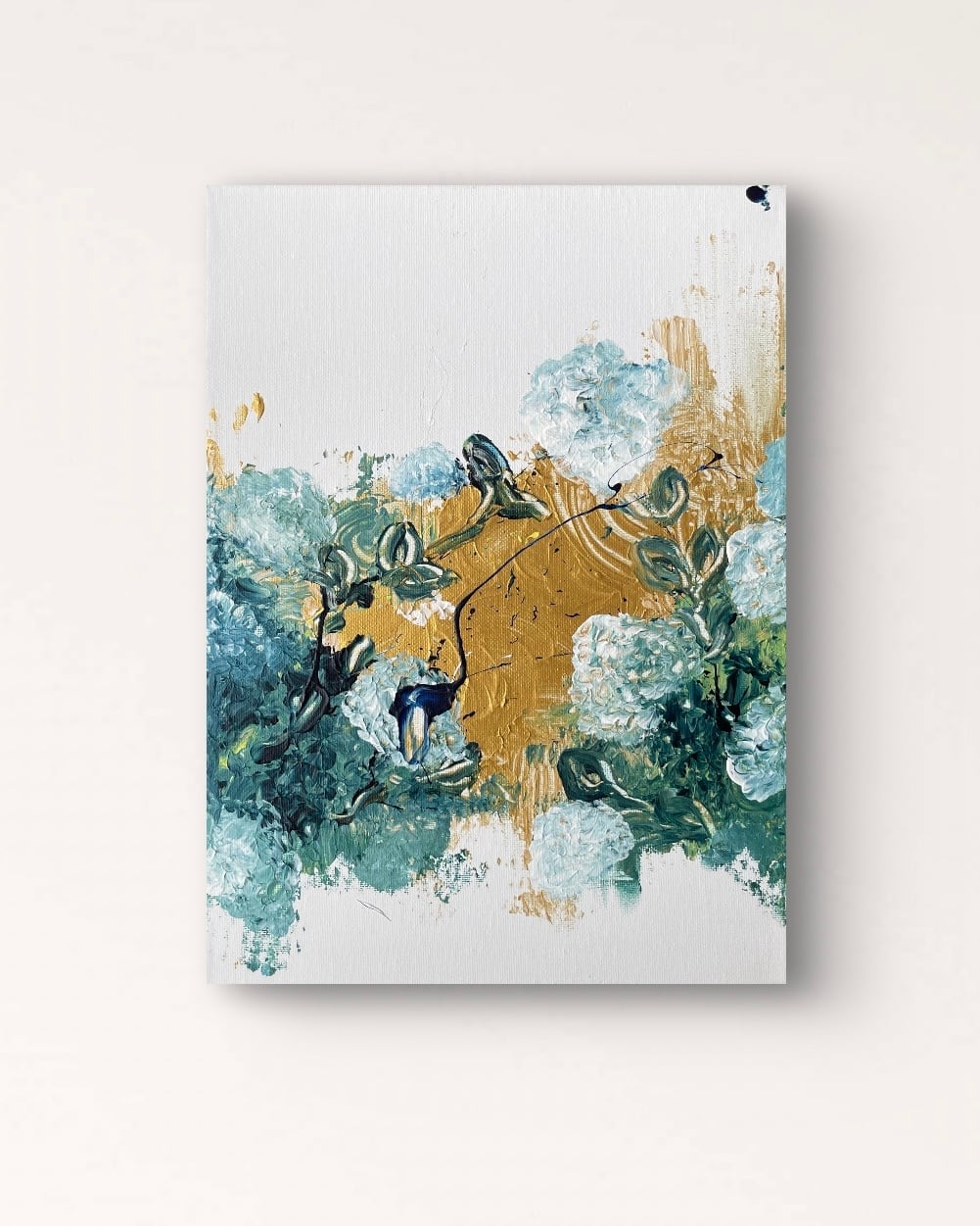 中央に配された金色の輝きは、木漏れ日のきらめきや、水面に反射する光を思わせ、作品全体に温かみと奥行きを与えています。