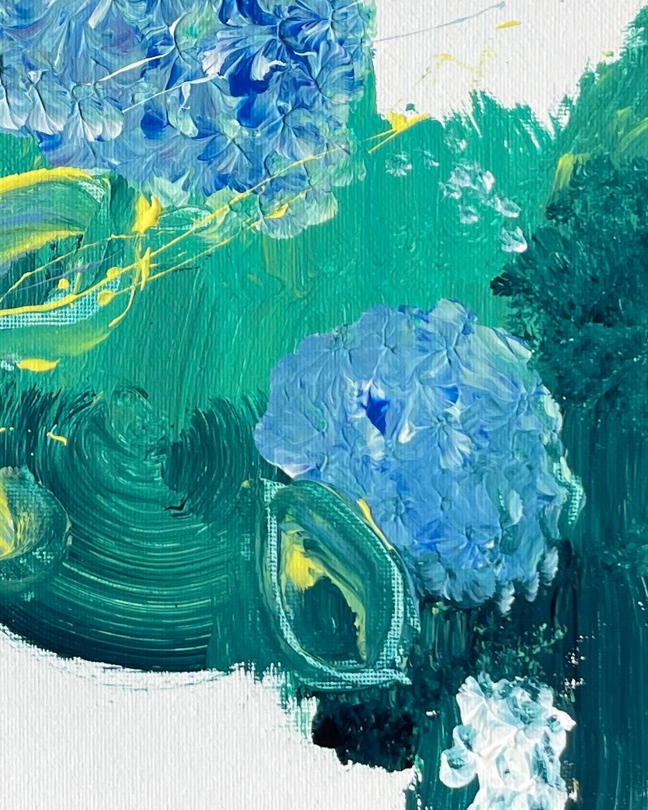 京都、智積院の庭園で、風に優しく揺れる青い紫陽花に魅せられ、アクリル絵の具でその情景を捉えました。