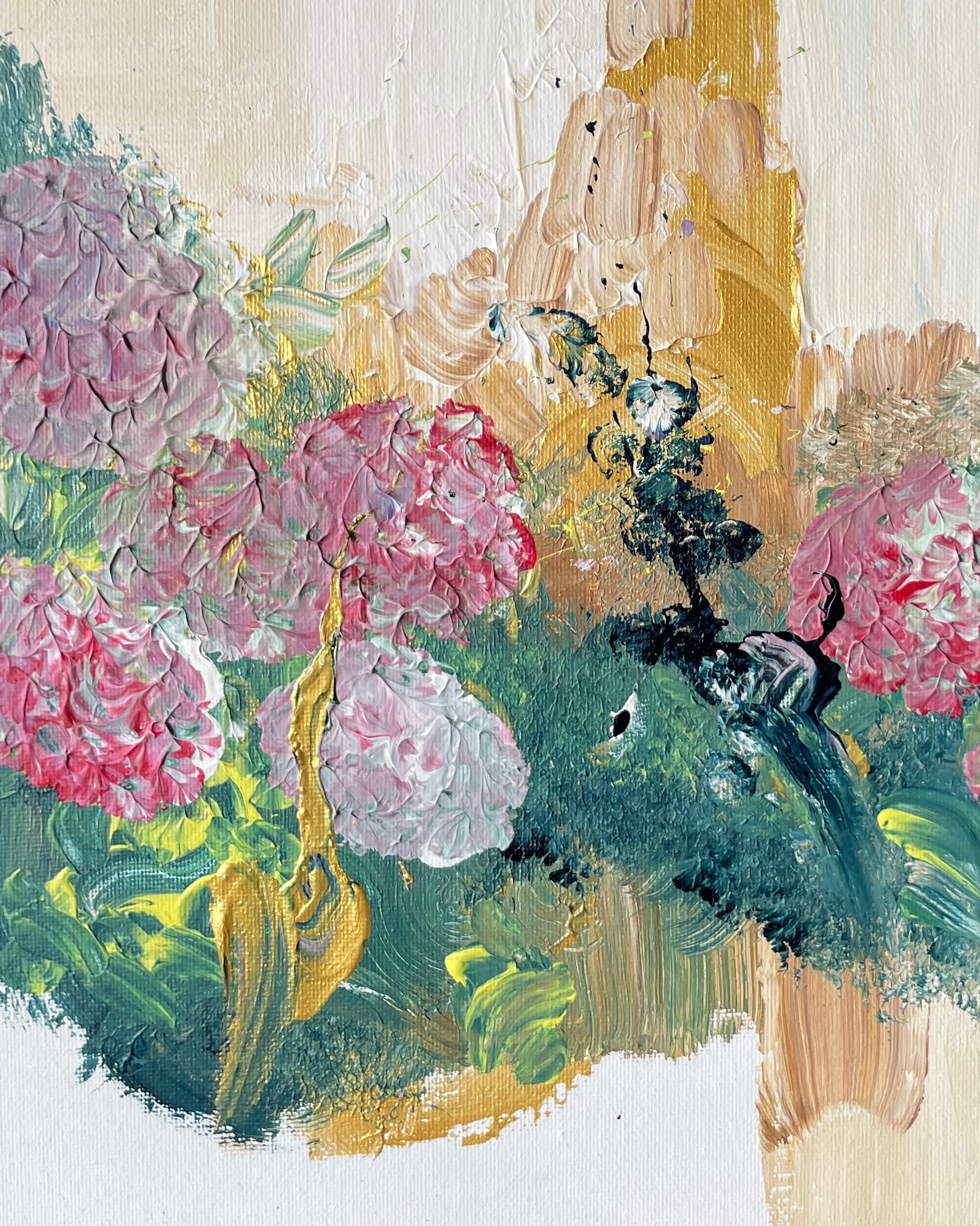 盛り上がるような筆致は、紫陽花のふくよかな存在感を際立たせ、背景のベージュや淡い緑、ゴールドのストロークは、智積院の歴史と自然が織りなす静謐な空気感を映し出しています。
