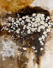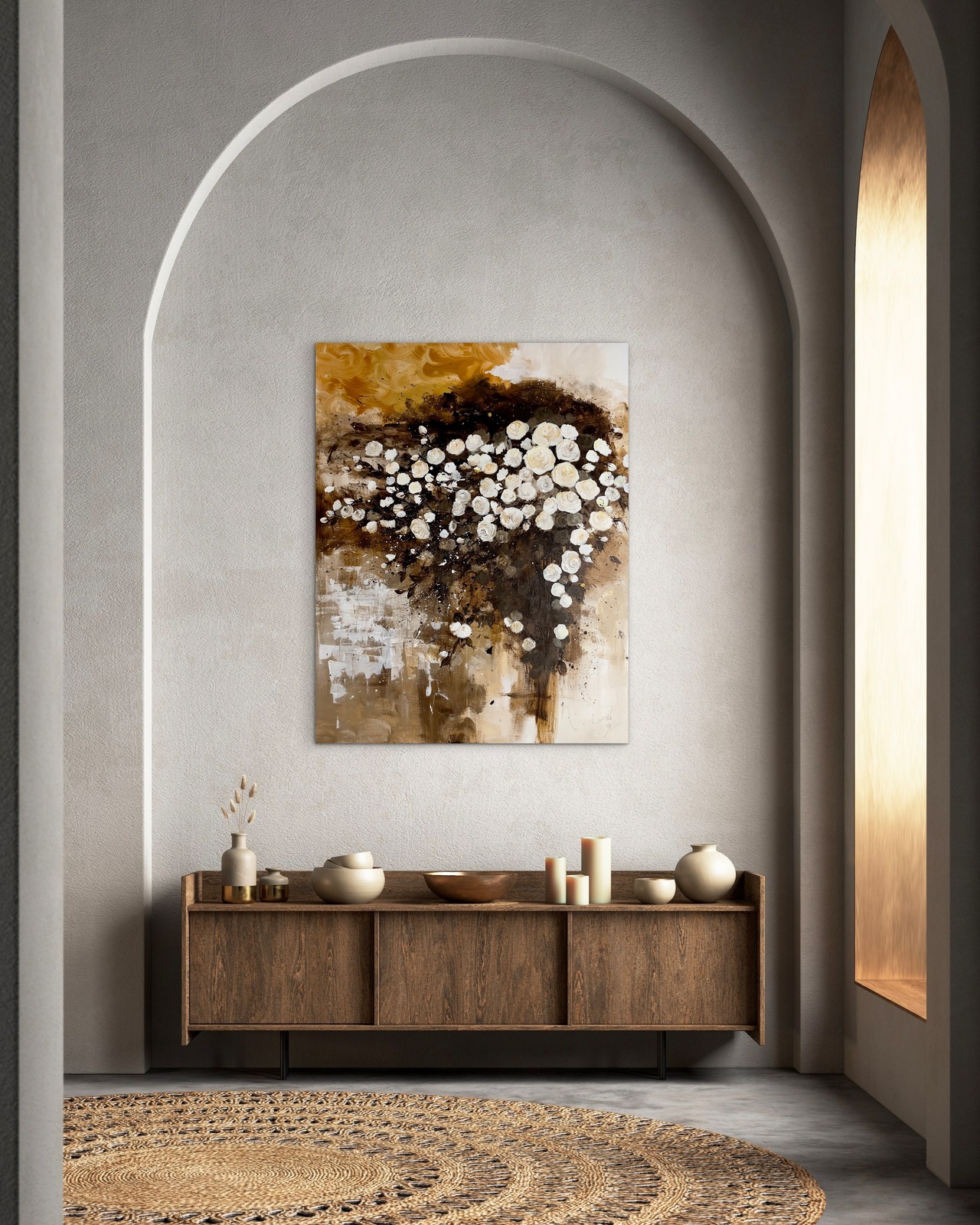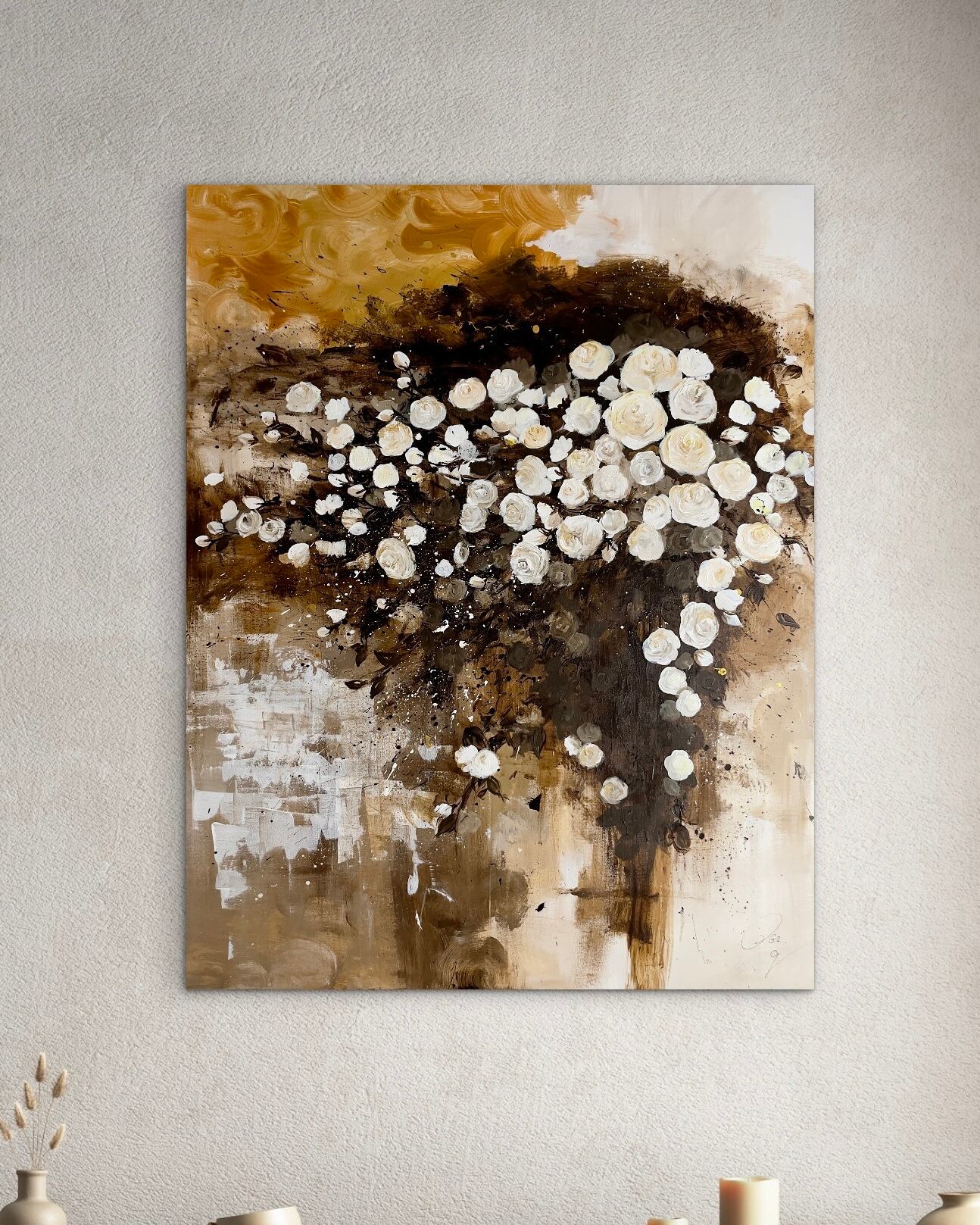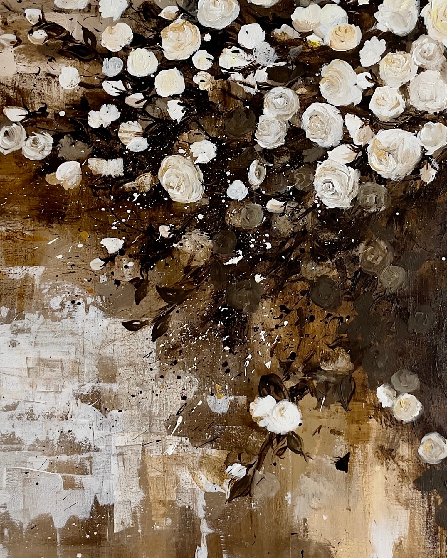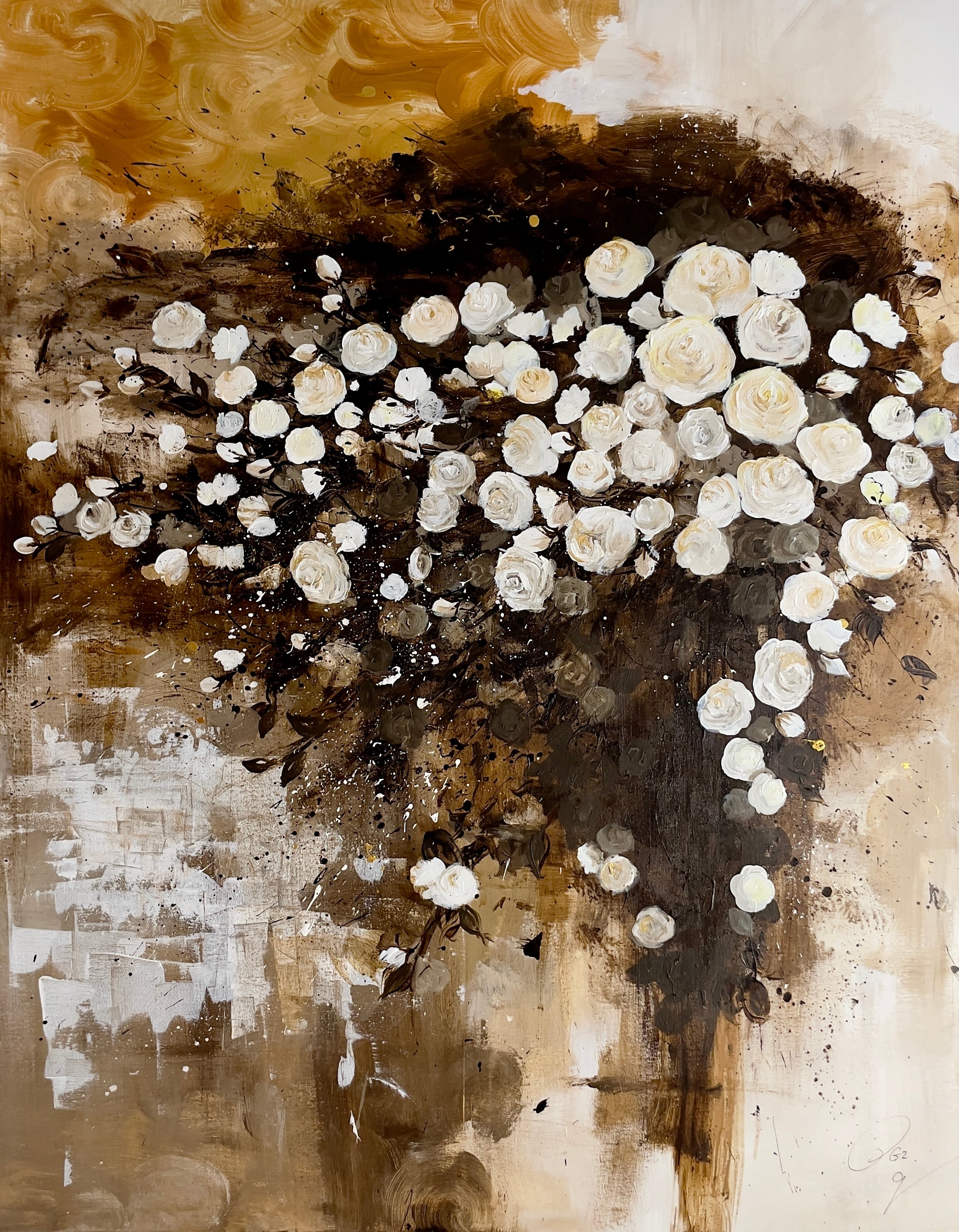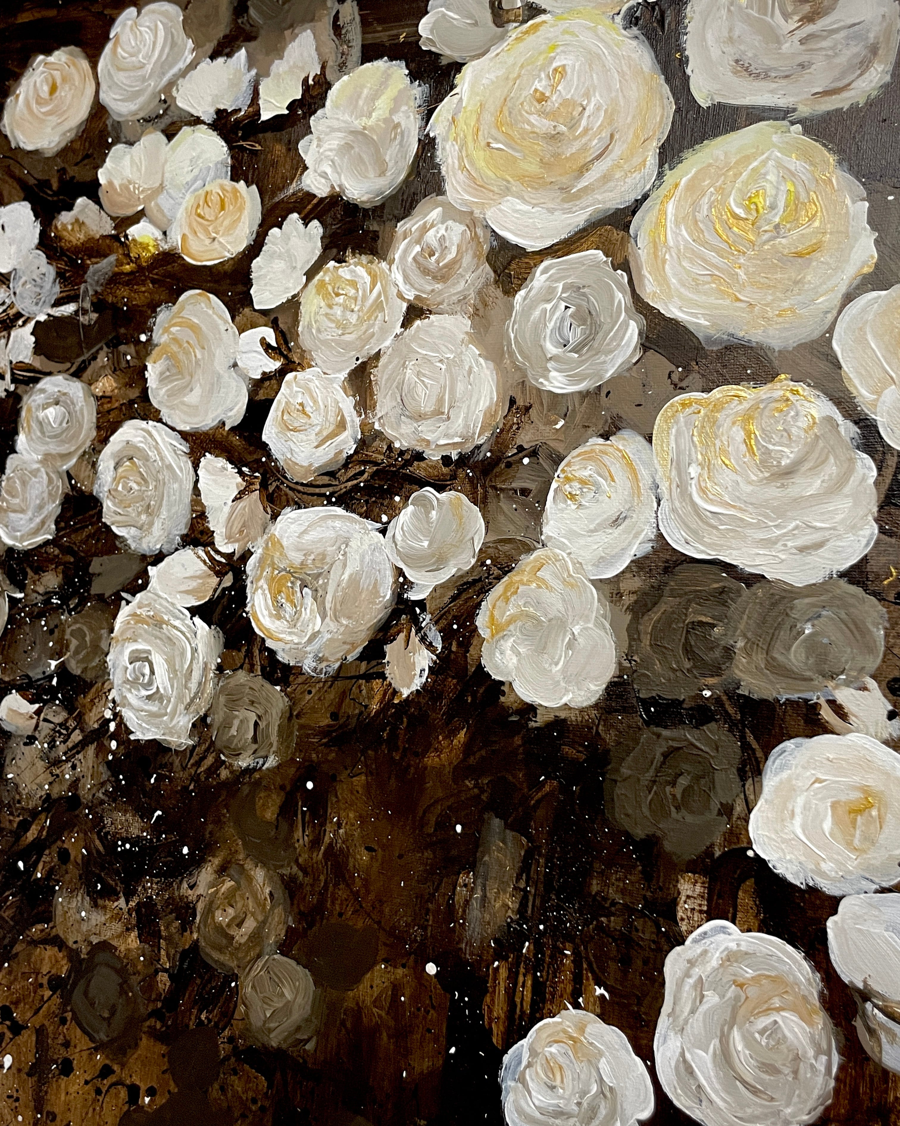 この作品は、アクリルペイントで描かれた金色と茶色を基調とした背景に、シックな白い薔薇が際立つ美しい作品です。