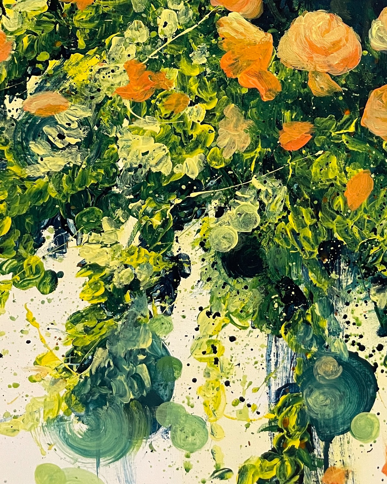 この作品は、大阪の中之島バラ園で咲く鮮やかな橙色の薔薇をアクリルペイントで描いたものです。