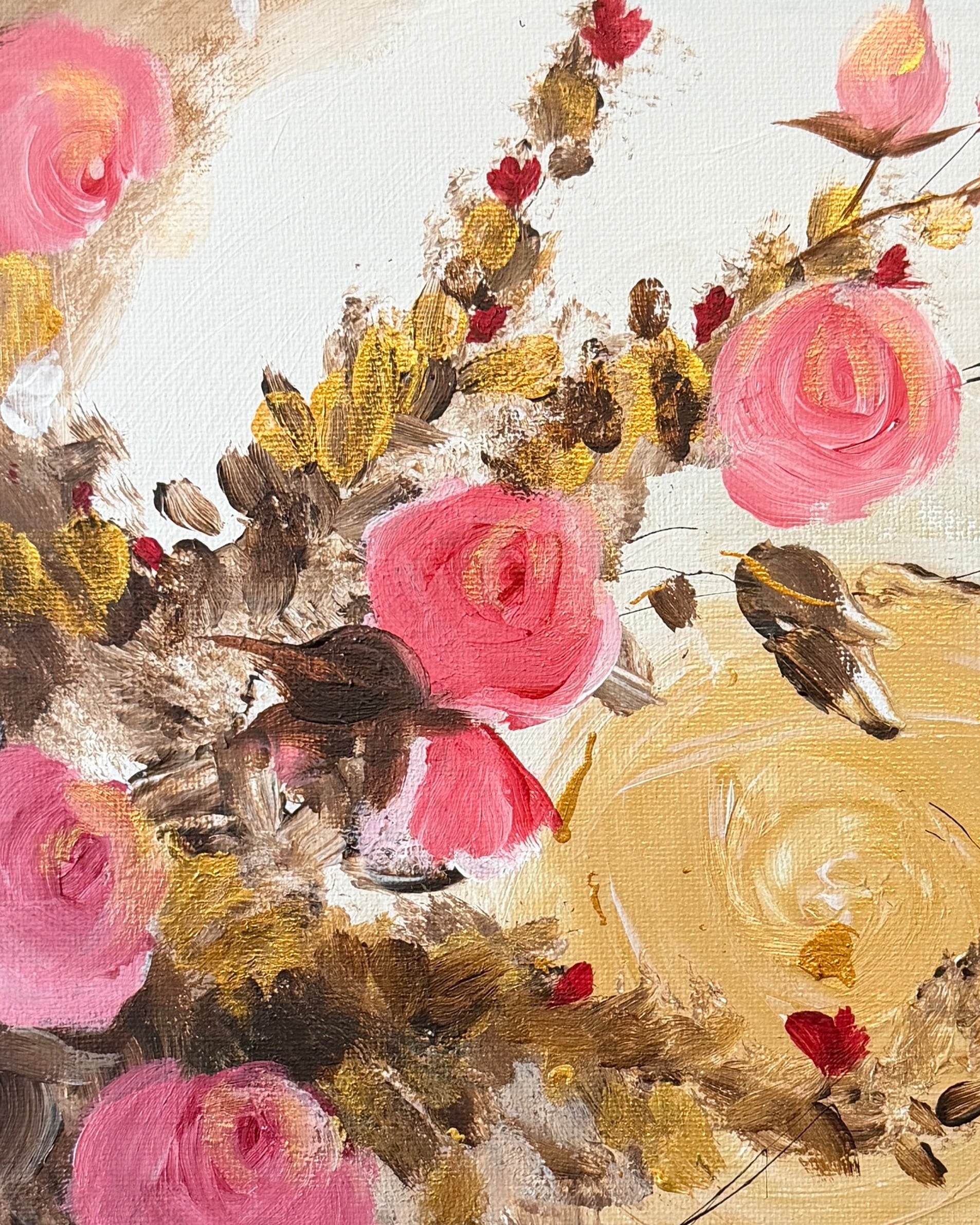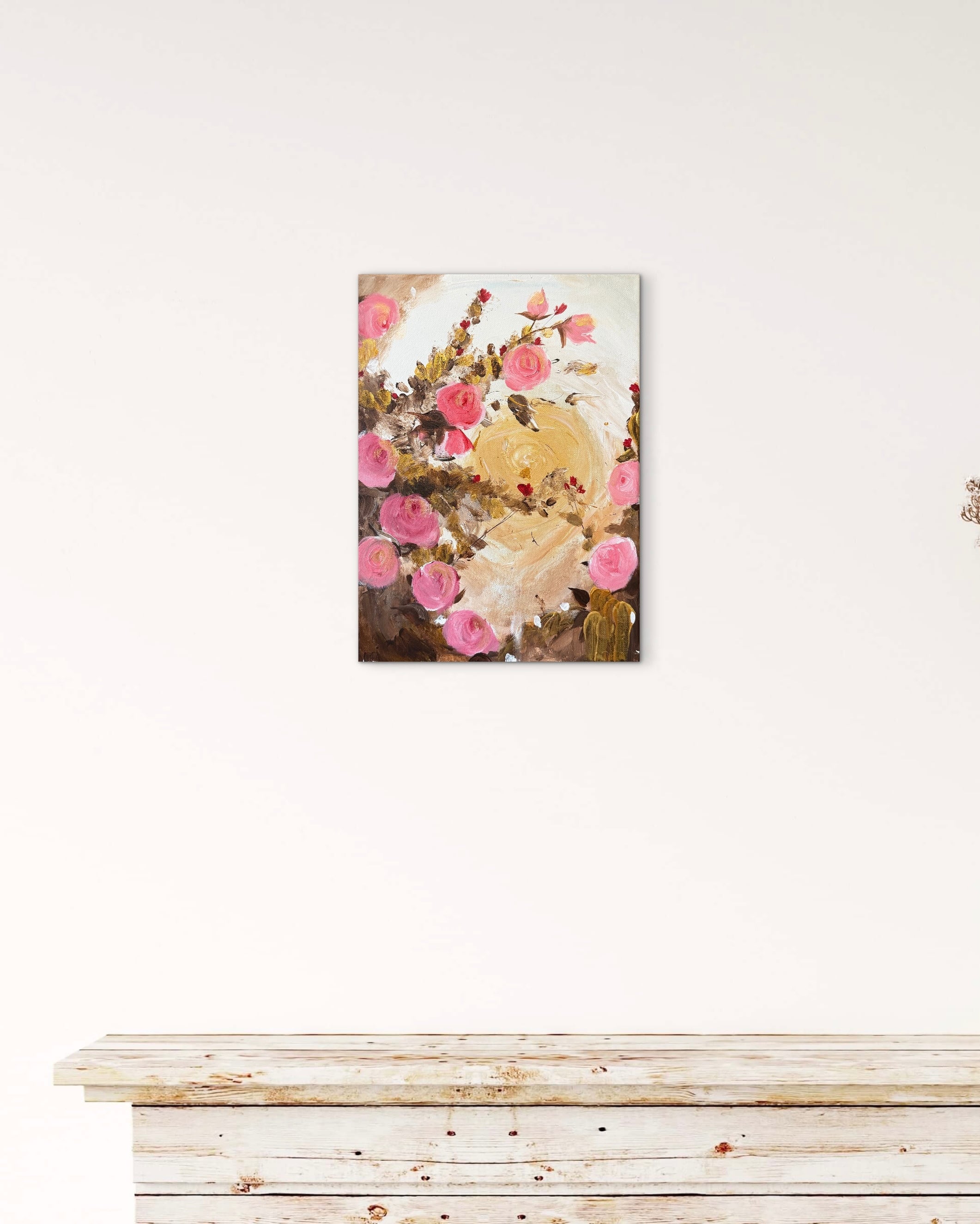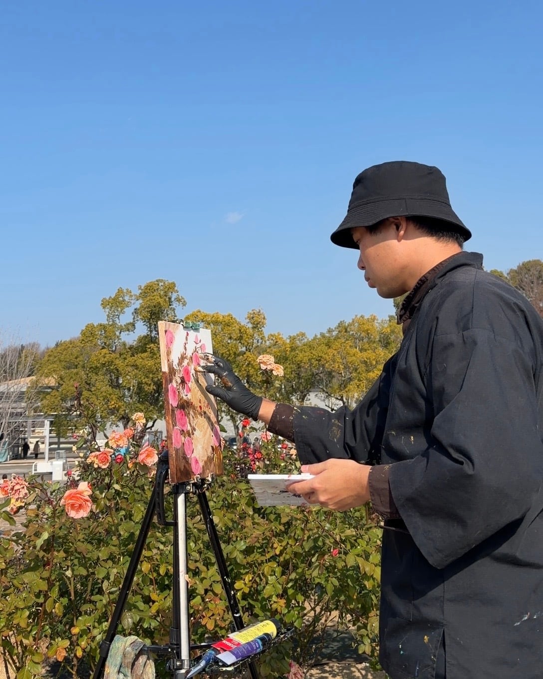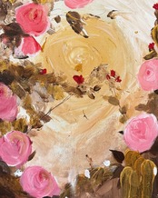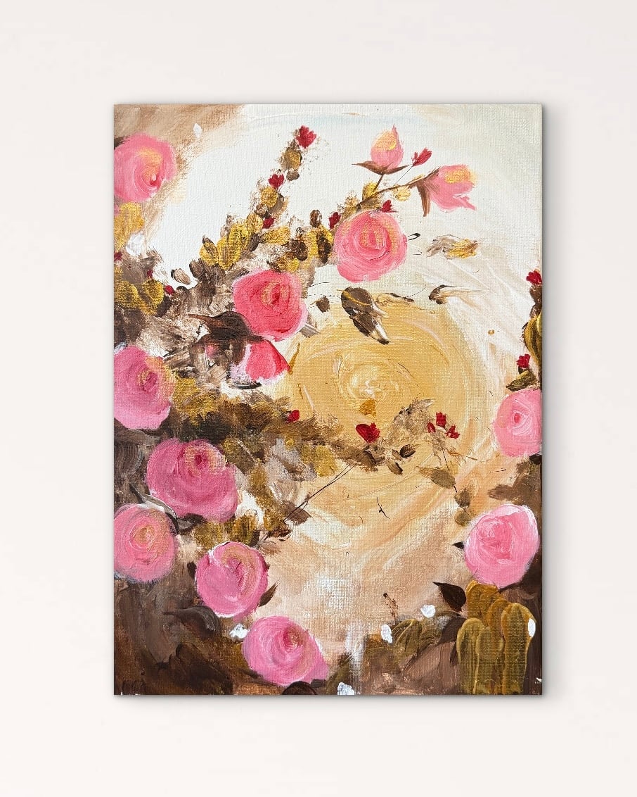 この作品は、兵庫県・万博記念公園で、冬の寒空の下に凛と輝く桃色の薔薇を、アクリルペイントで描きました。