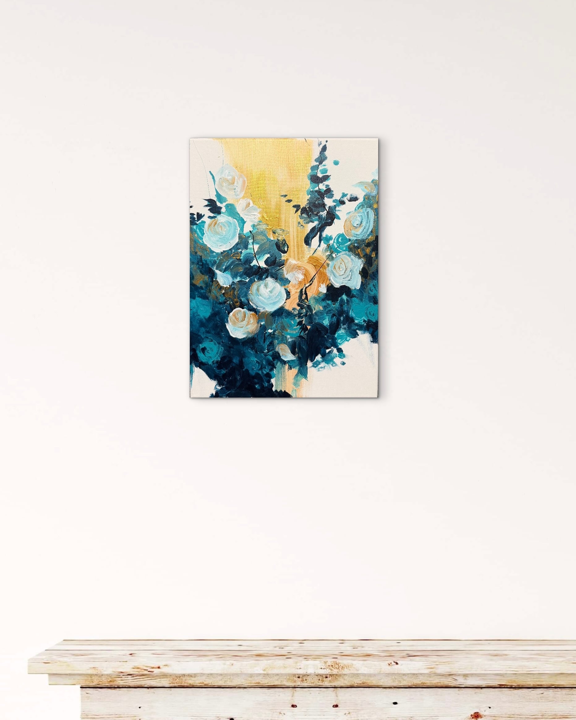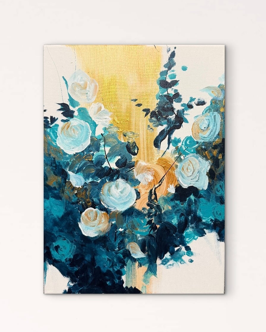 この作品は、兵庫県・須磨離宮公園で、冬の寒空の下に凛と咲く白い薔薇を、アクリルペイントで描きました。