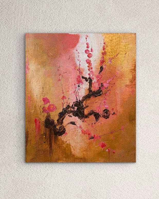 この作品は、大阪府・大阪城公園で、冬の寒空に凛と咲く桃色の梅を、アクリルペイントで描きました。