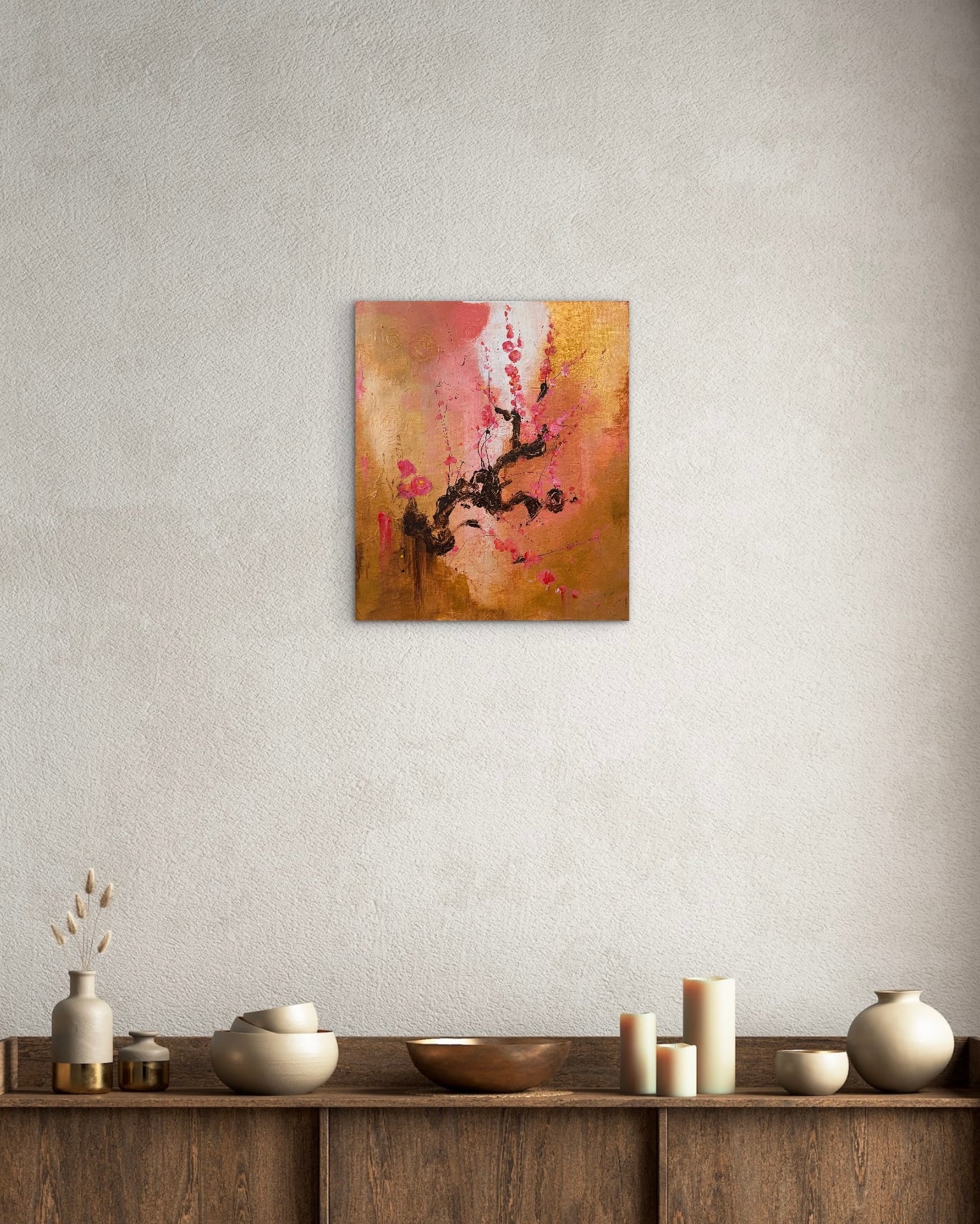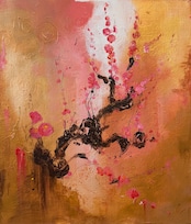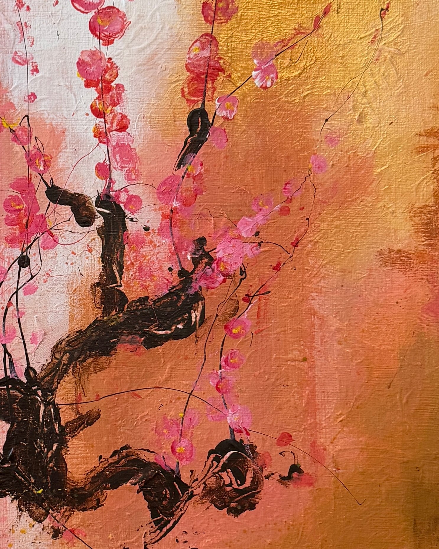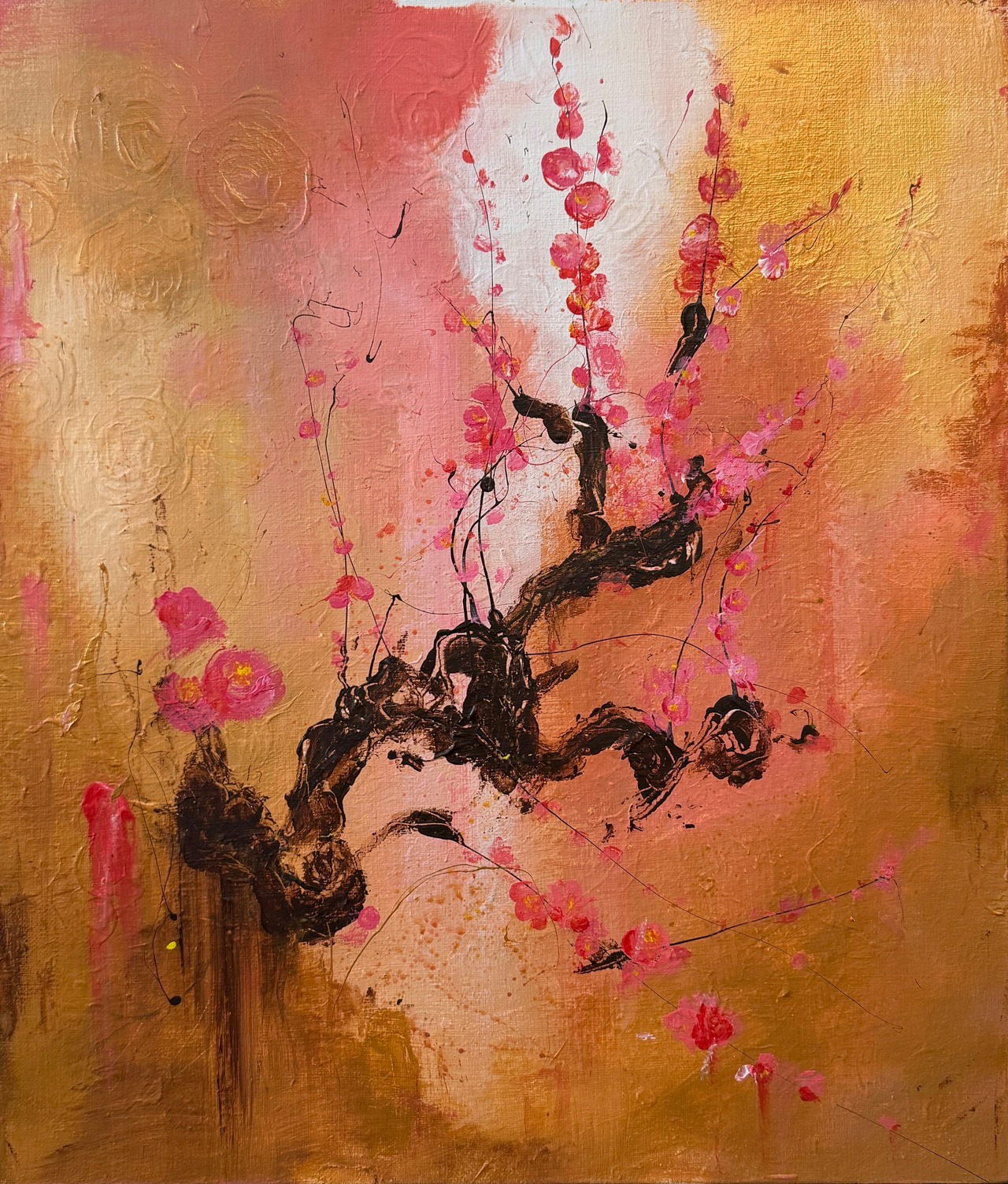 筆の荒々しいタッチと溶け合う色層が、花の儚さと力強さを同時に表現し、枝の黒が静かなコントラストを生み出しています。