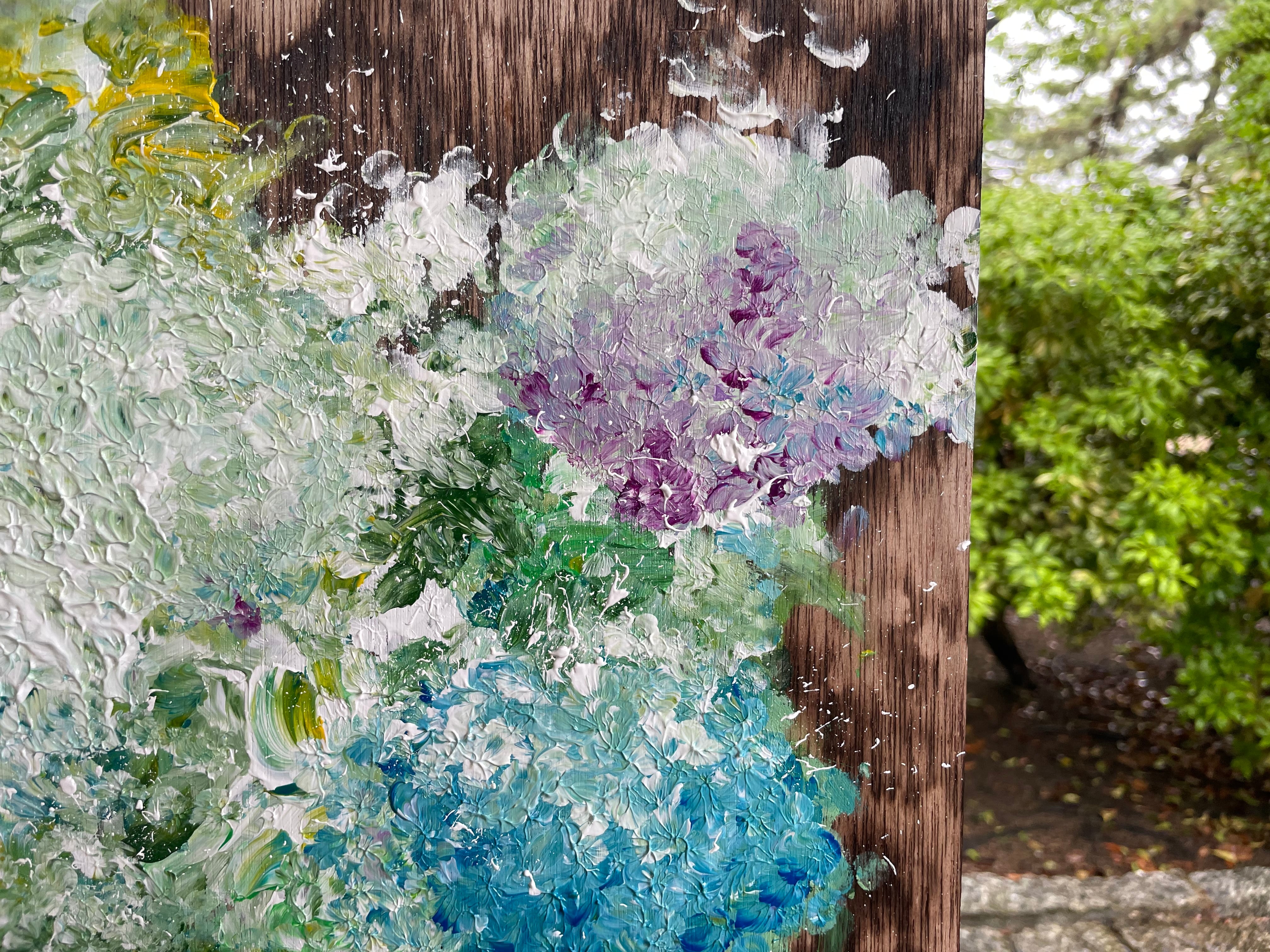 雨の中力強く咲く紫陽花をテーマに描きました。